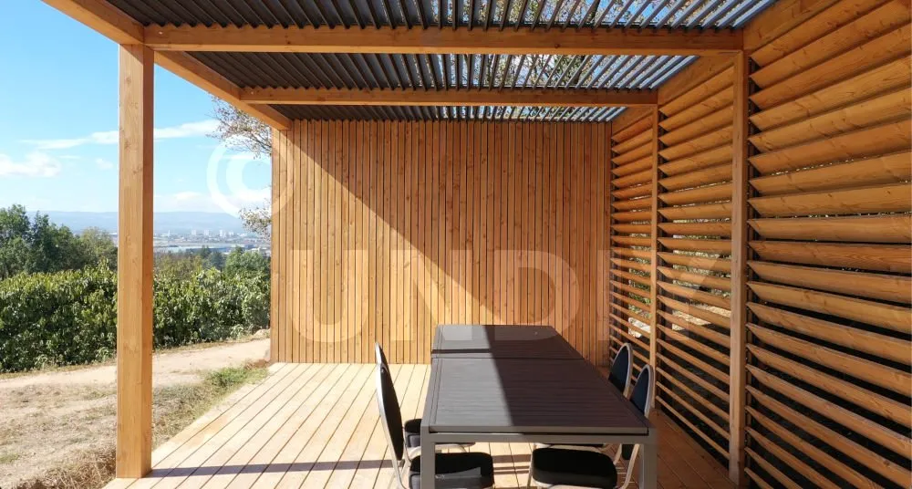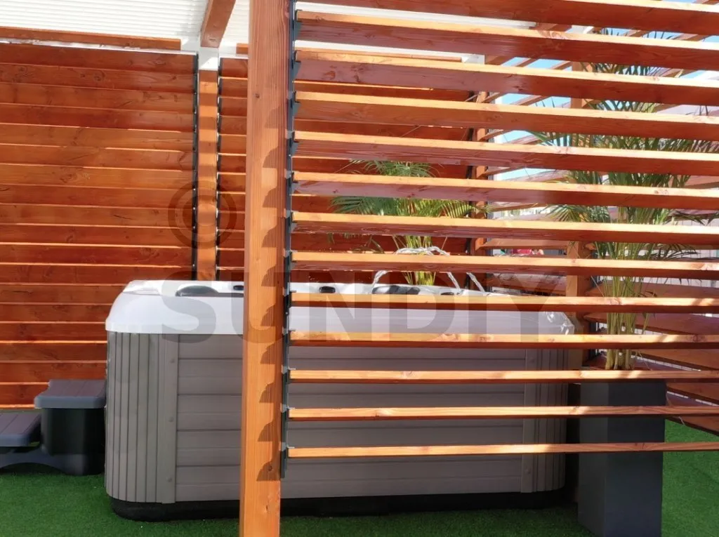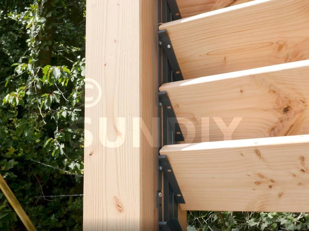 Les lames en bois offrent un rendu chaleureux et accueillant, idéal pour créer une atmosphère naturelle. Elles s’intègrent parfaitement dans les environnements extérieurs végétalisés et apportent une touche artisanale unique. Chez SUNDIY, nous utilisons principalement du bois Douglas, reconnu pour sa durabilité et son origine locale, issue de forêts gérées durablement.