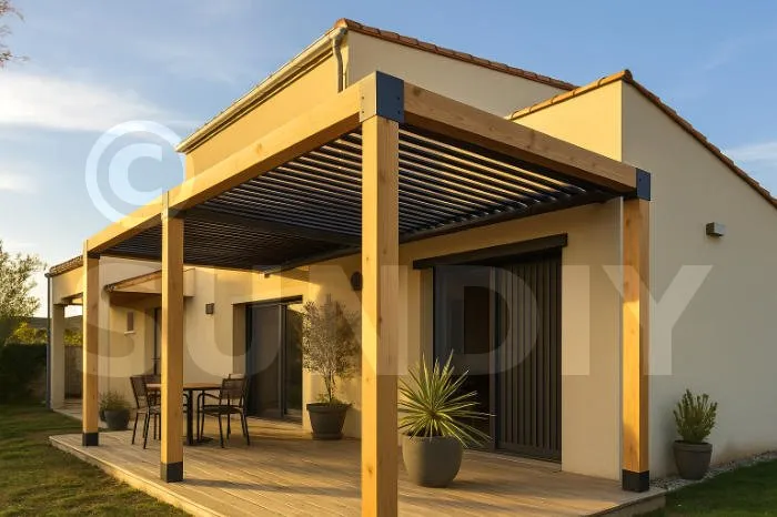 Une configuration très appréciée consiste à utiliser des lames aluminium en toiture (pour l’étanchéité et la résistance) et des lames bois sur les côtés (pour la chaleur et le rendu naturel).