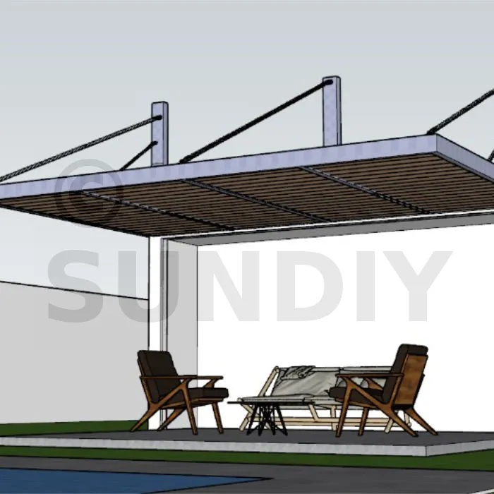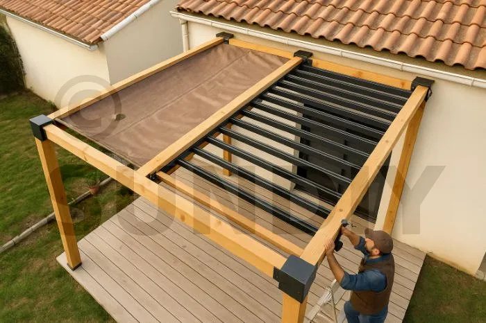 Les mécanismes SUNDIY se fixent aussi bien sur du bois que sur du métal, de l’aluminium ou du béton. La pose s’effectue simplement à l’aide de clips vissés sur la structure existante, sans soudure ni outillage spécifique. Cette polyvalence est idéale pour la rénovation de pergolas, carports, brise-vues, abris ou toute autre structure à toiture plane ou inclinée.