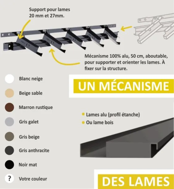Le kit SUNDIY, entièrement personnalisable, s’adapte à tous types de structures et peut être ajusté sur mesure selon vos besoins. De plus, vous avez la possibilité de choisir la couleur qui correspond le mieux à vos envies.