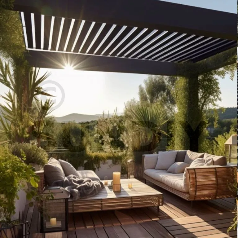 Les lames orientables de notre mécanisme permettent non seulement de régler l’intensité de lumière naturelle mais aussi de ventiler naturellement l’espace couvert. En ajustant l’angle des lames, il est possible de créer des zones d’ombre tout en laissant circuler l’air frais, réduisant ainsi la sensation de chaleur suffocante souvent ressentie sous le soleil tropical.