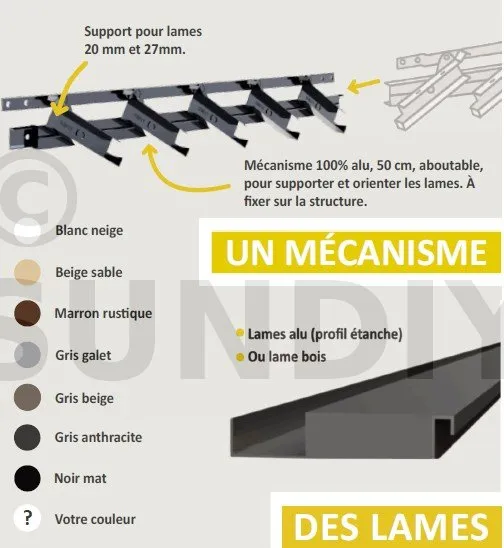 Chez SUNDIY, nous comprenons que chaque client a des attentes et des compétences différentes en matière de bricolage. C’est pourquoi notre kit pergola bioclimatique est pensé pour être facilement monté par des particuliers, même ceux ayant peu d’expérience en construction.