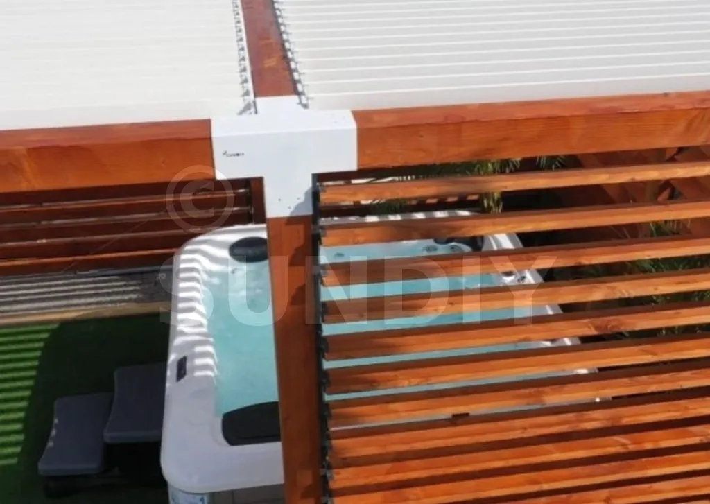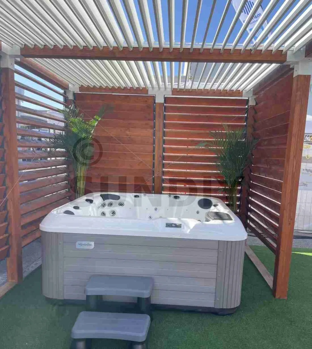 - L’utilisation de lames en aluminium pour la toiture garantit une protection supplémentaire contre la chaleur, réduisant ainsi l’évaporation de l’eau du SPA. Le toit et les brise-vues offrent une protection efficace contre les impuretés extérieures, ce qui réduit la fréquence nécessaire de nettoyage.