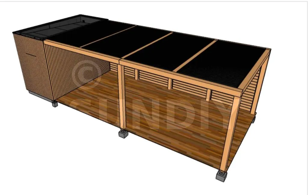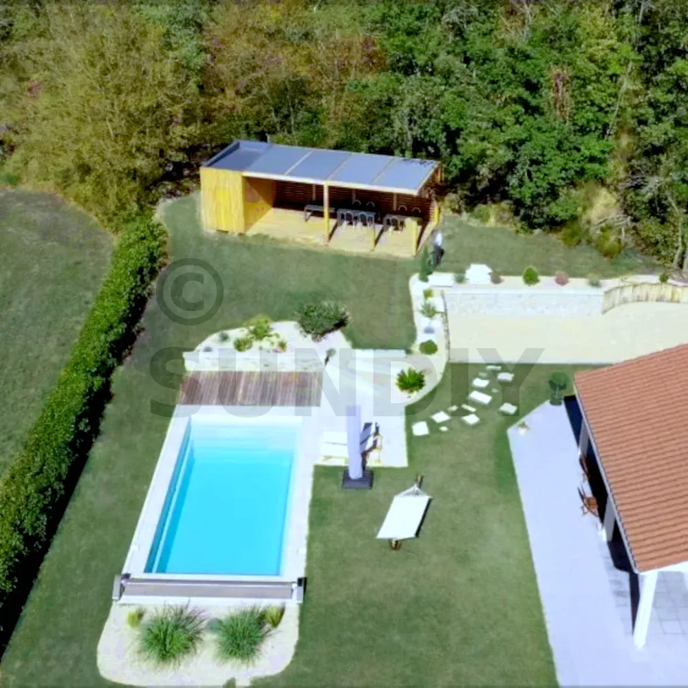 de LYONNous avons construit un poolhouse qui nous permet d'avoir un endroit pour nous abriter du soleil lors de nos moments à la piscine et d'avoir un rangement pour nos affaires. Nous avons opté pour un poolhouse équipé du kit pour lames orientables SUNDIY. Étant installés à proximité d'une forêt, nous devions jongler avec le déplacement du soleil et l'ombre des arbres en fin de journée. Cela nous permet d'ajuster la luminosité tout au long de la journée.