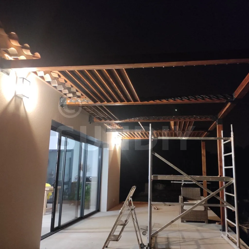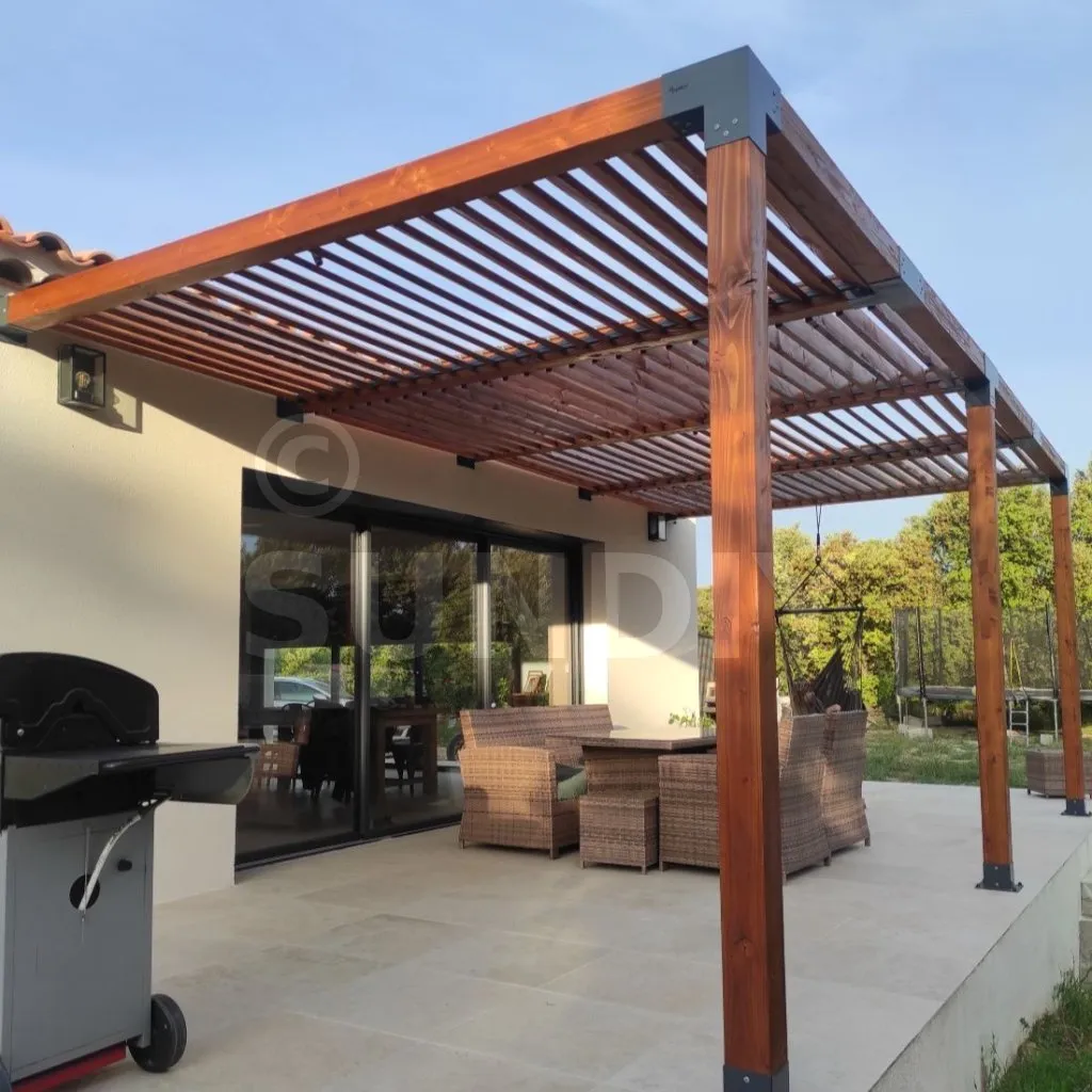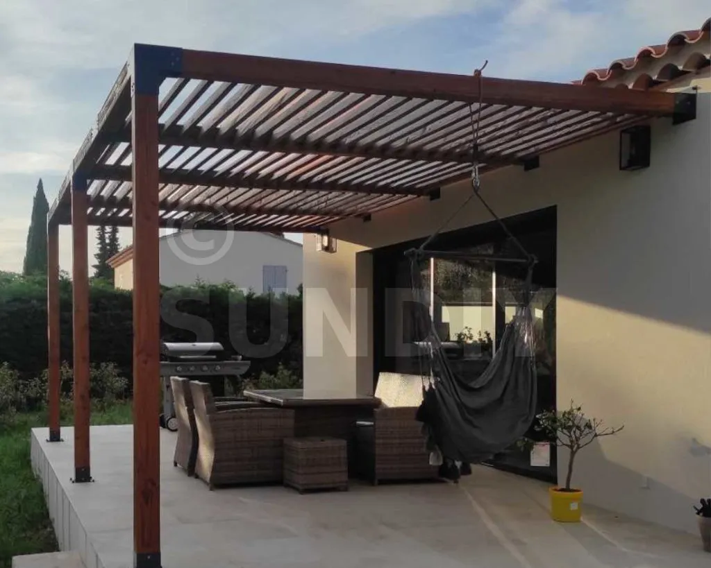 Concernant la pergola, j'ai opté pour les lames en bois plus chaleureuses. Cela demande du travail de saturation, mais le rendu est superbe. Le système permettant la mobilité des lames est simple à mettre en place et surtout de qualité (alu, vis Inox). Les lames sont très maniables, aucun blocage à signaler même manuellement.