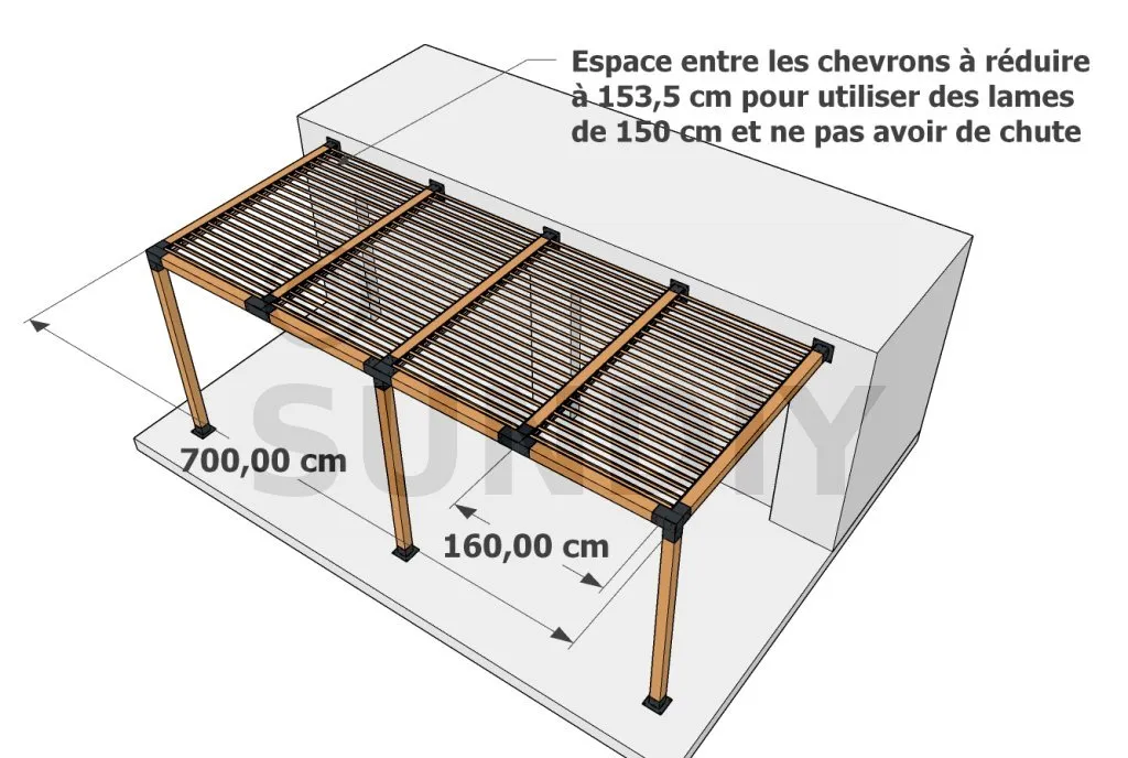 Notre client a demandé une pergola adossée de 7 mètres de large sur 3 mètres de profondeur. La hauteur totale sera ajustée à cause des coffres de volets, une fois que les mesures exactes auront été prises.