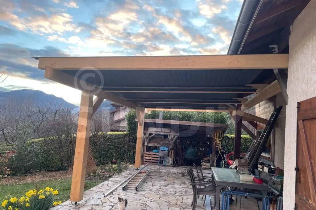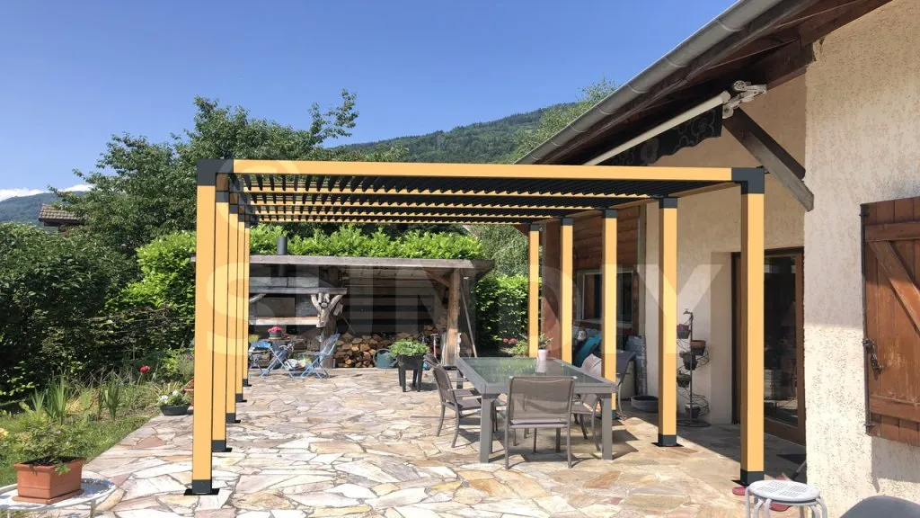 Nous avons fait installer une pergola en bois adossée à notre maison, et le résultat est magnifique. Les lames en aluminium anthracite ajoutent une touche contemporaine tout en s'intégrant parfaitement au style de notre maison.
