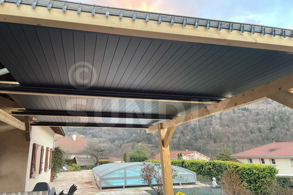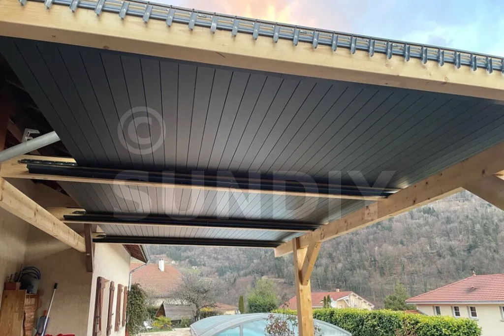 - Composition : Une structure en bois lamellé collé avec des lames alu, mécanisme 20 mm gris anthracite.