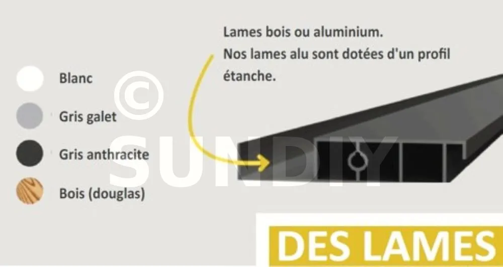 Notre kit de lames orientables SUNDIY est entièrement personnalisable, permettant la création d’une pergola bioclimatique sur mesure répondant parfaitement à vos attentes. Avec un choix de lames aux couleurs variées et de différents matériaux, vous avez la possibilité de choisir entre la chaleur du bois ou la modernité de l’aluminium, voire même de les combiner !