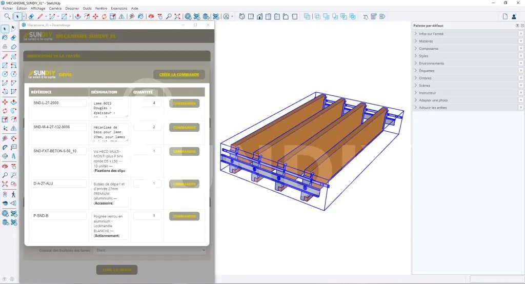 Modéliser une travée à lames orientables, ce n’est pas juste faire un faire un joli rendu 3D. Il faut choisir le bon type de lames, la couleur, les mécanismes et l’actionnement, gérer les fixations et le support (bois, maçonnerie, acier), puis obtenir un récapitulatif d’achat fiable pour commander. Mécanisme SUNDIY XL s’occupe de tout ça automatiquement et vous permet de le faire directement dans SketchUp. Le plugin associé avec ce composant fonctionne avec les versions récentes de SketchUp (2022 à 2025).