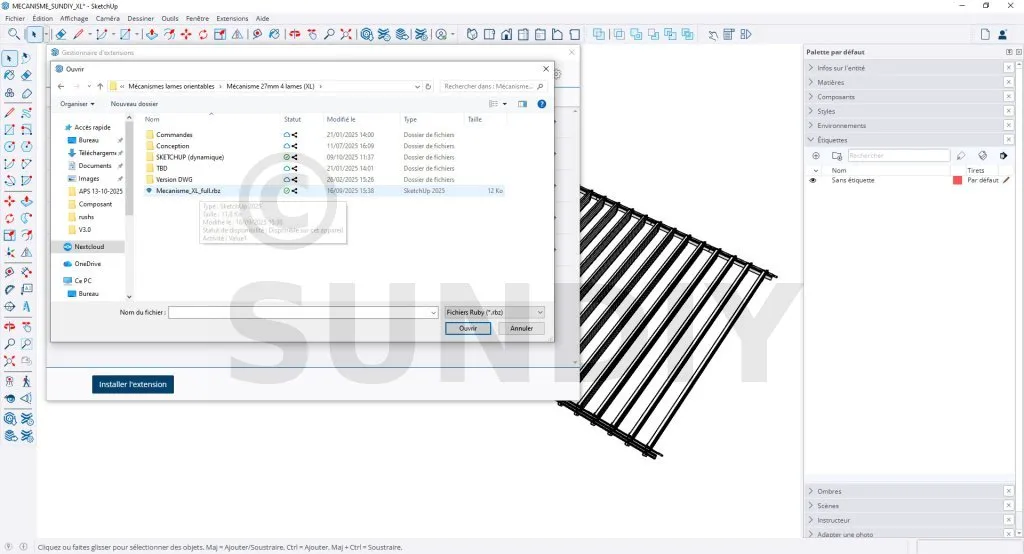 Pour utiliser cette version du composant dynamique Mécanisme SUNDIY XL, téléchargez le fichier Mecanisme_XL_full.rbz, puis suivez les étapes suivantes pour installer le plugin :