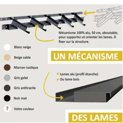 Notre kit de lames orientables peut être entièrement personnalisable et utilisé de manière indépendante. En effet, il est composé d’un mécanisme de 50 cm aboutable et recoupable sur chantier selon la longueur de la portée. Il s’adapte à tout type de structure, neuve ou existante.