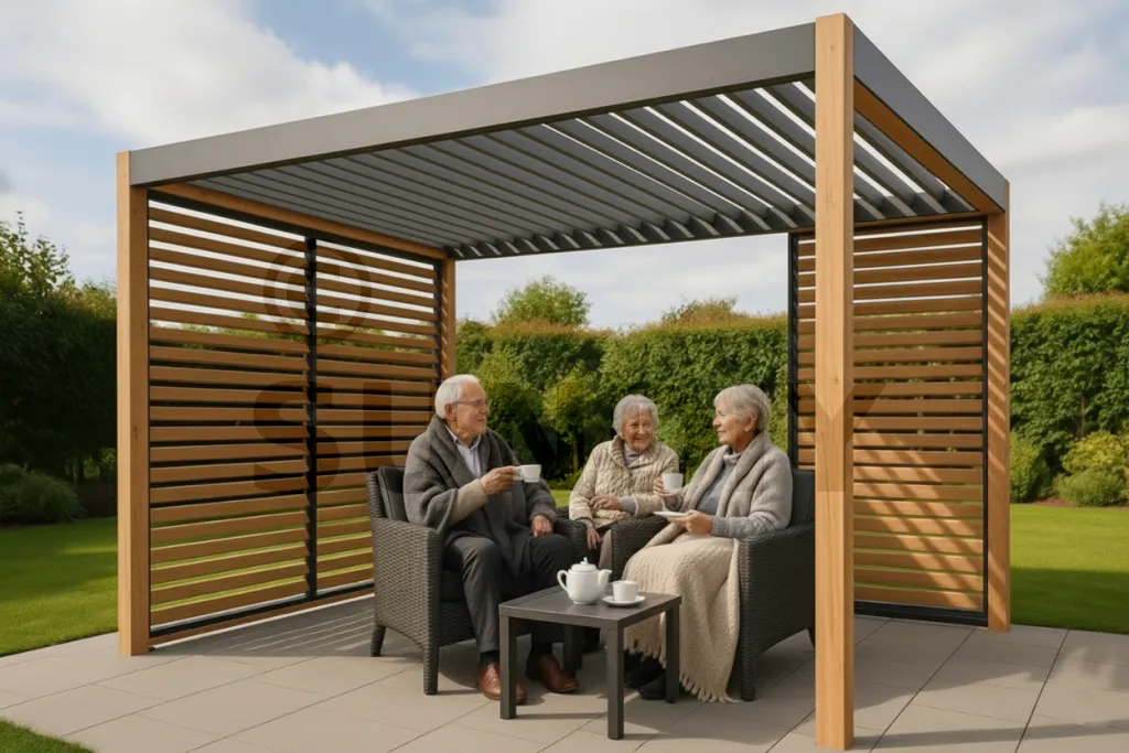 Le pilotage par capteurs (soleil, vent, pluie) automatise les gestes, la motorisation simplifie l’exploitation, et les finitions (alu/bois, teintes au nuancier) s’intègrent à l’architecture et aux parcours PMR sans ajouter de charge quotidienne.