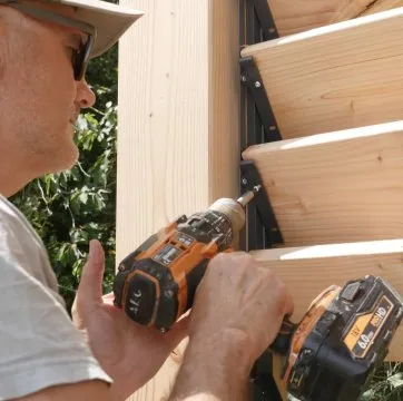 La fixation des mécanismes se fait en trois temps. Il faut tout d’abord fixer sur votre structure les clips avec des vis inox, similaires à celles utilisées pour les terrasses en bois. Vous pourrez ensuite y clipser le mécanisme et répéter l’opération le long de votre travée. Les mécanismes sont ensuite liés les uns aux autres grâce à un rivet pour former une structure résistante et solidaire. Il ne reste plus qu’à placer les lames dans les portes-lames du mécanisme.
